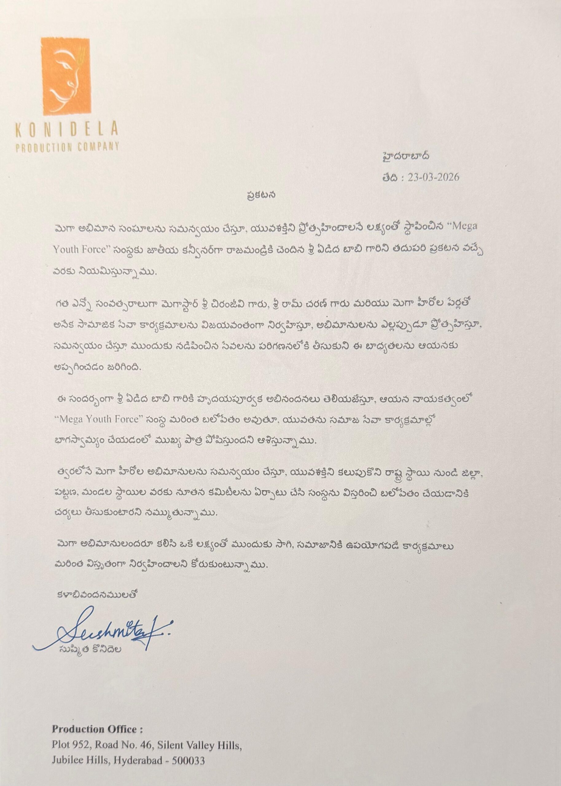 మెగా అభిమాన సంఘాలను సమన్వయం చేస్తూ, యువశక్తిని ప్రోత్సహించాలనే లక్ష్యంతో స్థాపించిన “Mega Youth Force” సంస్థకు జాతీయ కన్వీనర్గా రాజమండ్రికి చెందిన శ్రీ ఏడిద బాబి గారిని తదుపరి ప్రకటన వచ్చే వరకు నియమిస్తున్నాము.